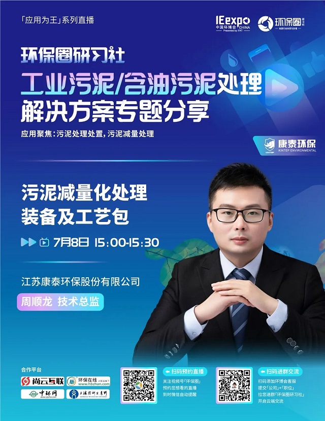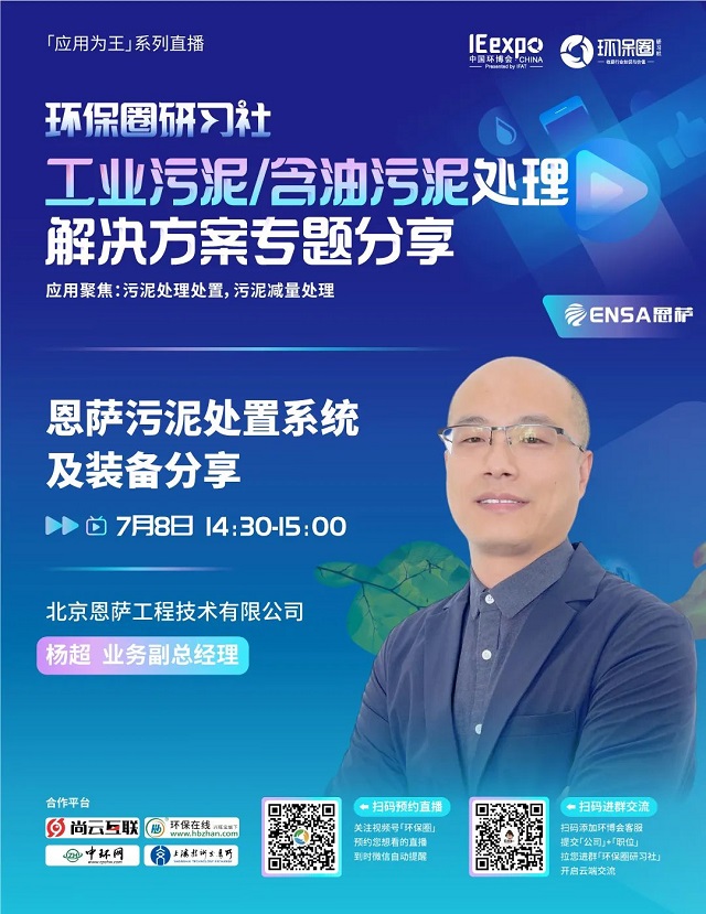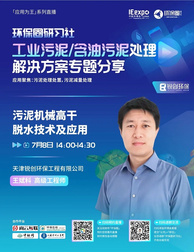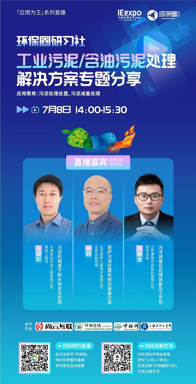 7月8日(星期五)下午14:00-15:30,環(huán)保圈研習(xí)社“應(yīng)用為王”系列直播工業(yè)污泥/含油污泥處理解決方案專題分享,有幸邀請(qǐng)到了銳創(chuàng)環(huán)保、北京恩薩、江蘇康泰環(huán)保3家企業(yè)的技術(shù)專家做客直播間,聚焦工業(yè)污泥/含油污泥處理,為大家分享污泥處理處置,污泥減量處理解決方案。