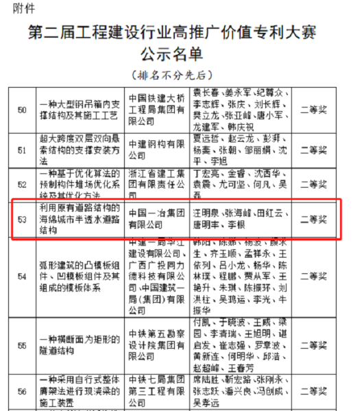 近日,在中國施工企業(yè)管理協(xié)會舉辦的第二屆工程建設(shè)行業(yè)高推廣價值專利大賽上,中國一冶城建公司推薦的《利用原有道路結(jié)構(gòu)的海綿城市半透水道路結(jié)構(gòu)》專利技術(shù)榮獲二等獎。