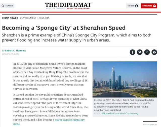 近日,國際知名的“外交學(xué)者”網(wǎng)站(The Diplomat )發(fā)表了一篇文章——《以深圳速度成為“海綿城市”》(Becoming a ‘Sponge City’ at Shenzhen Speed),關(guān)注中國海綿城市建設(shè)。該報道出自一位美國作家、高校講師羅伯特·索尼特(Robert C. Thornett)之手。作者曾經(jīng)到訪深圳參觀過福田紅樹林自然保護(hù)區(qū),作者也從多個具體的例子切入講述海綿城市在深圳的具體實踐。