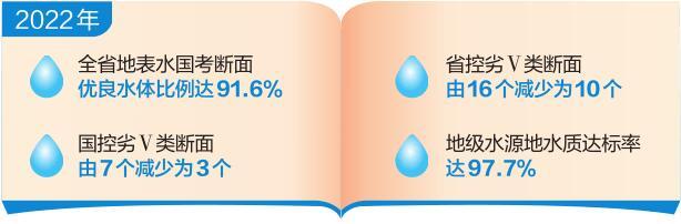 我省持續(xù)深入推進(jìn)水污染治理,集中攻堅消除劣Ⅴ類水質(zhì)斷面,全面提升水生態(tài)環(huán)境質(zhì)量。2022年,4項約束性指標(biāo)超額完成國考目標(biāo)。其中,全省地表水國考斷面優(yōu)良水體比例達(dá)91.6%;國控劣Ⅴ類斷面由7個減少為3個,省控由16個減少為10個,降幅明顯。地級水源地水質(zhì)達(dá)標(biāo)率達(dá)到97.7%。