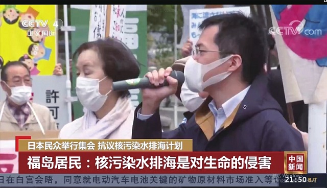 抗議集會上,“311甲狀腺癌兒童支援網絡”成員岡田俊子介紹了《核污染水排放入海的爭論點——氚的危險性》一書。該書作者之一渡邊悅司是福島核泄漏事故的受害者,去年2月因癌癥去世,堅決反對核污染水排放入海是她的遺愿。書中介紹了核污染水對人體的影響,并指出福島核事故后,當地至少已有300多名兒童確診甲狀腺癌。