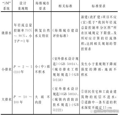 內(nèi)澇成因復(fù)雜,解決內(nèi)澇必須從問題產(chǎn)生的根源著手,運用滯、蓄、排等技術(shù)手段,充分發(fā)揮基于海綿城市理念的“3M”系統(tǒng)效能,綜合治理(見表1)。源頭減排系統(tǒng)旨在恢復(fù)場地開發(fā)前自然水文特征,應(yīng)對低強度大概率(一般在1年一遇重現(xiàn)期以下)的中小降雨事件;小排水系統(tǒng)重點解決及時排除短時強降雨帶來的徑流量劇增,應(yīng)對較大概率的短歷時強降雨事件,一般在2——10年一遇降雨條件下達(dá)到“地面無積水”;大排水系統(tǒng)重點是對超標(biāo)徑流進(jìn)行合理蓄、排,應(yīng)對小概率的超強降雨 事 件,一般在10——100年一遇降雨條件下,滿足“大雨不內(nèi)澇”。海綿城市理論的系統(tǒng)性要求“3M”各系統(tǒng)之間在規(guī)劃設(shè)計、標(biāo)準(zhǔn)應(yīng)用、豎向控制等方面做好充分銜接,綜合發(fā)揮效能,應(yīng)對水生態(tài)與水安全問題。