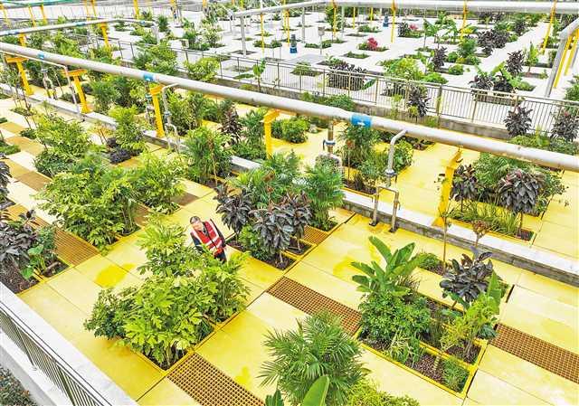 從空中俯瞰,散尾葵、芭蕉等47種植物共5302株有規律地分布在約3300平方米的食物鏈反應器頂部。置身其間,如同漫步公園,聞不到一絲異味。這得益于該污水處理廠采用的世界上先進的食物鏈反應器FCR工藝。該工藝構建了一個高度多樣化的生態系統,在封閉的食物鏈反應器里,有超過3000種微生物、47種水生植物附著在特殊材料和植物根系表面,通過新陳代謝降解污水中的污染物。