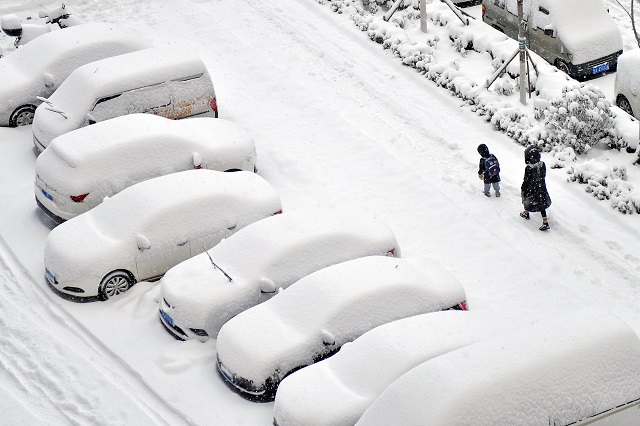 圖為山東省煙臺市福山區市民在雪中出行。圖源人民圖片網