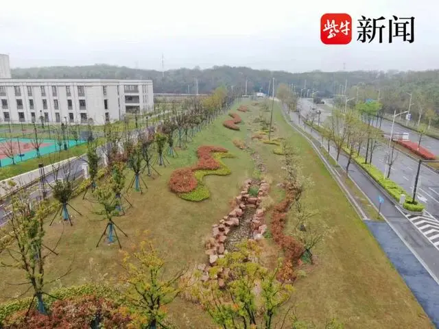 法治園區(qū)配套道路及環(huán)境提升工程位于南京市江北新區(qū)沿山大道以東,浦鎮(zhèn)大街以南。在完善片區(qū)路網(wǎng)的同時,該項目因地制宜布局下凹綠地、透水鋪裝、植草溝、溢流式雨水口、滲透管等海綿設施,通過觀賞花草種植、天然石鋪地、植物組團點綴等形式打造特色旱溪景觀,實現(xiàn)生態(tài)功能與景觀效果的統(tǒng)一。
