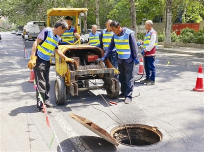 圖為排水工人加緊對(duì)雨水管道、污水管道進(jìn)行疏通。