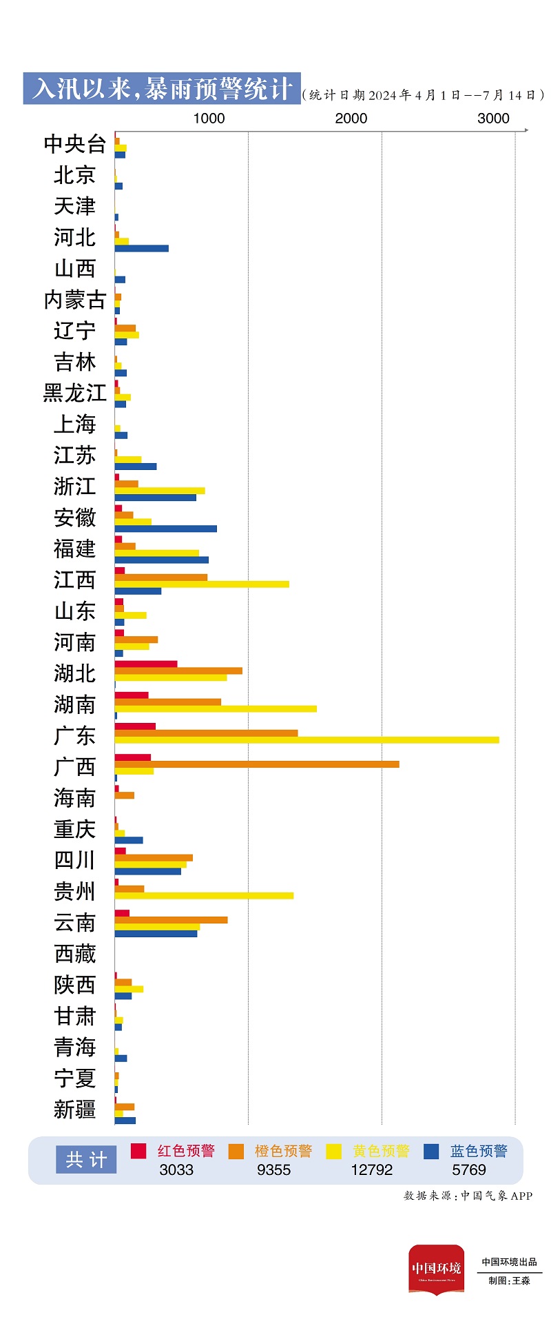 單月暴雨紅色預(yù)警同比增加61.1% 梳理發(fā)現(xiàn),4月1日入汛以來(lái),全國(guó)發(fā)布?xì)庀箢A(yù)警信息16萬(wàn)條,其中暴雨預(yù)警氣象災(zāi)害預(yù)警信息達(dá)到3萬(wàn)余條,占比18.83%。據(jù)統(tǒng)計(jì),截止7月14日,中央氣象臺(tái)共計(jì)發(fā)布暴雨紅色預(yù)警9次。從全國(guó)情況來(lái)看,廣東發(fā)布暴雨預(yù)警信息4569條,湖北發(fā)布暴雨紅色預(yù)警信息多達(dá)470條。