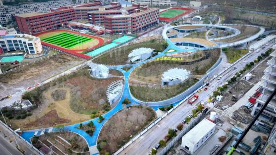 該綠地位于上海臨港滴水湖西側(cè),北鄰洛神花路,南至雪絨花路,東至白荊路,西至云皓路,南側(cè)緊鄰規(guī)劃公交首末站。建設(shè)總用地面積約56109.4平方米,項(xiàng)目以“立體公園、綠色碳匯”為主題進(jìn)行設(shè)計(jì)施工。巧妙利用地形起伏構(gòu)建出不同高差道路,并融入周邊多個(gè)住宅小區(qū)、寫(xiě)字樓以及華東師范大學(xué)附屬幼兒園、附屬中學(xué),實(shí)現(xiàn)與環(huán)境的生態(tài)共聯(lián),并為周邊各類人群提供了地上地下豎向立體的休憩空間。同時(shí),該綠地大規(guī)模運(yùn)用環(huán)保材料與精心配置的碳匯植物,打造了綠色屋頂、透水鋪裝、雨水花園等一系列先進(jìn)的海綿設(shè)施,充分發(fā)揮綠地系統(tǒng)“滲、滯、蓄”的功能,從而達(dá)到雨水源頭“凈”的目標(biāo),將景觀功能與生態(tài)功能一體化,在確保排水防澇安全的前提下,最大限度地實(shí)現(xiàn)雨水的積存、滲透和凈化,促進(jìn)雨水資源的利用和生態(tài)環(huán)境保護(hù)。