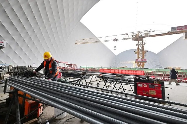 “基坑氣膜”工地,工人正在綁扎鋼筋。