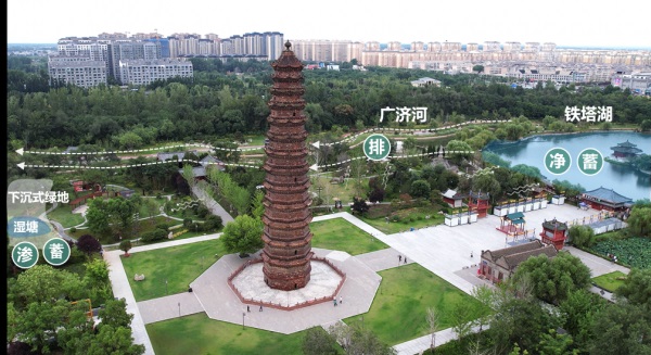 開封市素有“八朝古都”之稱,古代城市格局延續(xù)至今,歷史上提出了“地高則溝之,下則堤之,命之曰金城”的治水理念,強調(diào)因地制宜、順其自然,形成了四河泄水、城墻障水、湖澤蓄水的排水體系,與海綿城市理念不謀而合。
