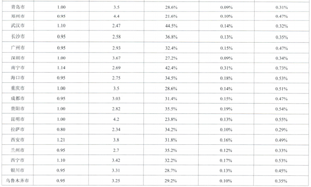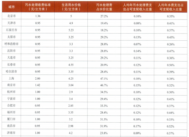 在重點調研的36個大、中城市污水處理收費標準、居民生活用水價格(第一階梯)、年人均生活用水量、人均可支配收入等的數據基礎上,計算各城市污水處理費有關占比情況,如表1所示。