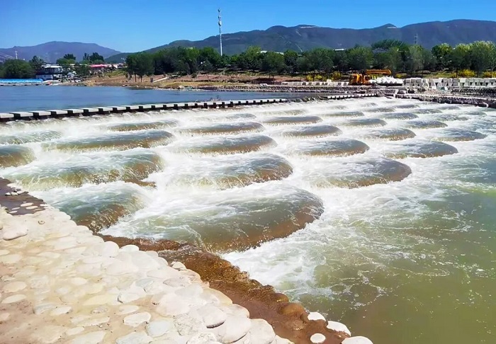 施工現(xiàn)場穩(wěn)中有序 保障安全前提下減少對生態(tài)的影響 在蓮石湖跌水修復施工現(xiàn)場,河道岸坡已被修葺一新,湖中央設計的三級圍堰跌水結構,通過高低落差的層次感減緩上游水流流速。而在門城湖的魚鱗跌水,則是通過階梯式的魚鱗結構實現(xiàn)水流消能。