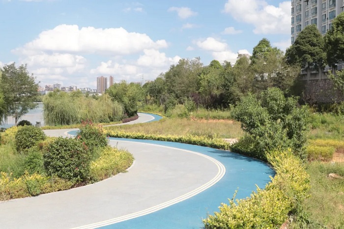 位于安順經開區的花山綠道,總長約2.4公里,保留原162鐵路原始風貌,沿線設置三線文化廣場、休息椅等設施,同時鋪設透水路面、建設植草溝,既串聯起休閑健身與文化體驗功能,又能有效滯留雨水。老城環路虹山湖路段則打造了下沉式綠地、觀景平臺,夜晚燈光亮起時,成為市民休憩打卡的熱門地點。市政道路與背街小巷的海綿化改造也同步推進,通過鋪設透水路面、打造下凹式綠化帶等方式,讓雨水“落地即滲”。
