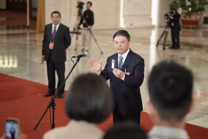 3月12日,北京,人民大會堂,十四屆全國人大四次會議第三場“部長通道”集中采訪活動,生態(tài)環(huán)境部部長黃潤秋接受記者采訪。(中青報(bào)·中青網(wǎng)記者 李雋輝/攝)